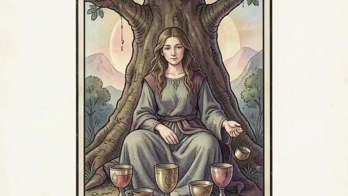 Четверка Кубков – одна из самых часто неправильно интерпретируемых карт в колоде. На классическом изображении Уэйта мы видим персонажа, сидящего под деревом, с откинутой головой и тремя кубками перед ним, а четвертый кубок откинут в сторону, предлагая новый путь. Эта сцена передаёт двойственность: с одной стороны – отстранённость, с другой – возможность.