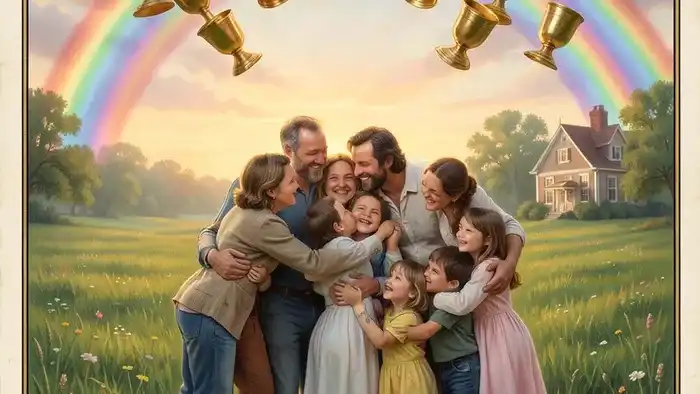 Взгляните на классическое изображение, созданное Памелой Колман Смит под руководством Артура Эдварда Уэйта. Семья: мужчина и женщина в открытых объятиях, дети, танцующие рядом, уютный дом вдали и, конечно, радуга с десятью кубками. Это не случайные детали.