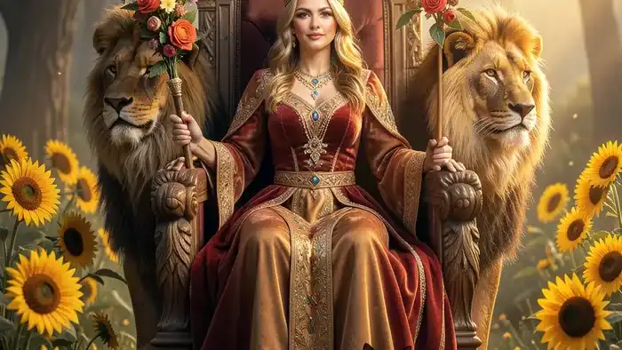 Если масть Жезлов — это энергия действия, воли, творческого порыва и карьеры, то её Королева представляет собой эту энергию, доведённую до уровня искусства. Она не просто действует — она действует с грацией и осознанностью. В традиции Райдера-Уэйта мы видим её восседающей на троне, держащей цветущий жезл, а у её ног — чёрная кошка, символ независимости и тайны. Солнечные подсолнухи и львы на троне прямо отсылают к астрологическому дому Льва и энергии Солнца.