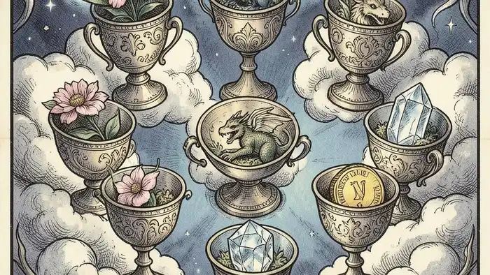 - Семерка Кубков сочетание таро символизирует иллюзии и возможности.