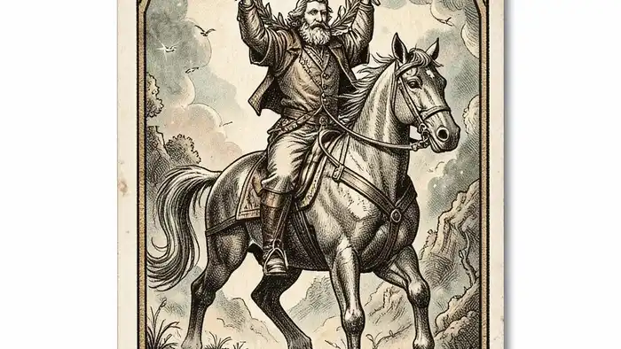 Главный герой карты держит жезл с венком, а вокруг него — радост��ые зрители. Ве��ок олицетворяет награду, а жезл — власть и энергию. Внимание к деталям, таким как цвет плаща, позиция лошадей и облака в небе, раскрывает дополнительные нюансы. Например, темные облака могут указывать на скрытую тревогу, а яркие цвета — на уверенность. По-видимому, каждый элемент служит подсказкой для интерпретатора.