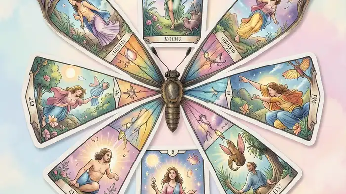 Символика Бабочки многослойна: крылья – это два полюса (физическое и духовное), центр – ядро трансформации, а узор на крыльях отражает связь с астрологией (например, знак Весов, управляемый Венерой, часто ассоциируется с балансом). В традиции Уэйта карта «Верховная Жрица» часто трактуется как «внутренний свет», а в раскладе «бабочка» её место занимает карта «Смерть», указывающая на необходимость отпустить старое.