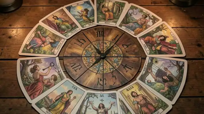 Символика времени в Таро уходит корнями в средневековые астрологические трактаты. В колоде Уэйта, например, карта «Колесо Фортуны» часто ассоциируется с цикличностью и ритмами. В более современных практиках, таких как расклад «часы», каждый час представляет отдельный «поток» энергии, который может быть «заполнен» или «опустошён».