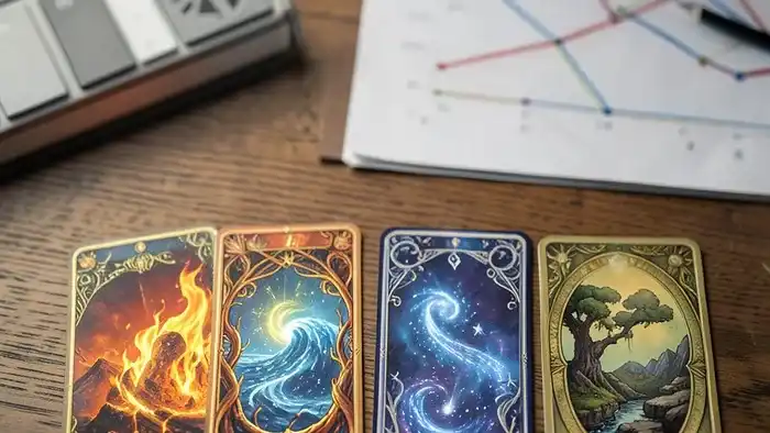 Сядьте за стол, положите перед собой четыре карты, по одной на каждую стихию. Закройте глаза и представьте, как каждый элемент «пишет» вам подсказку. После 5 минут запишите, какие слова, образы или чувства пришли. Это поможет уточнить интерпретацию карт.