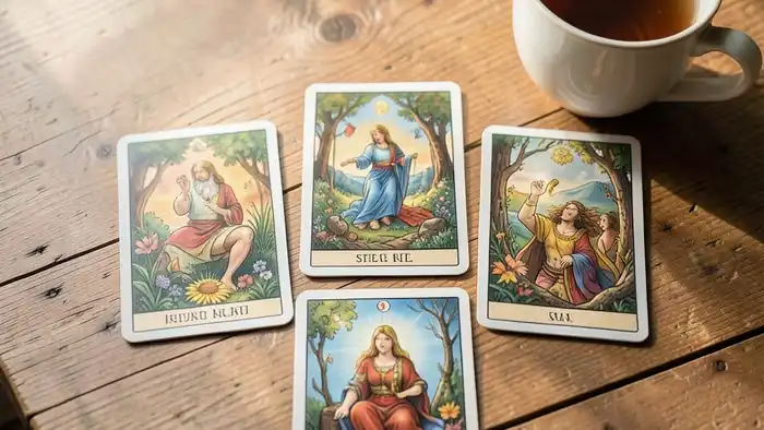 Здесь часто появляются карты, связанные с мыслями: Отшельник – изоляция, Справедливость – переоценка решений. Карта Тройка Жезлов может указывать на излишнюю аналитичность.