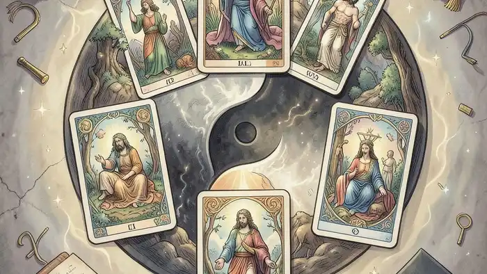 Концепция инь‑ян пришла из китайской космологии, где свет и тьма, активное и пассивное находятся в постоянном взаимодействии. В Таро эти принципы нашли отражение в архетипах карт, где каждая карта несёт в себе как светлую, так и темную сторону. По теории Юнга, архетипы Таро – это коллективное бессознательное, а баланс инь‑ян помогает интегрировать противоположные аспекты личности.