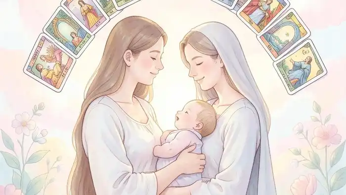 - Верховная Жрица + Десятка Пентаклей: Символизирует глубокую связь с интуицией и финансовую стабильность, позволяющую сосредоточиться на грудном вскармливании.
