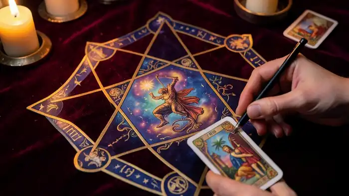 Пентаграмма появляется в различных культурах: от древних шумеров до средневековых алхимиков. В христианстве она символизирует Пять Плодов Духа, в герметизме – пять элементов, а в современной оккультизме – соединение материального и духовного. В Таро пентаграмма часто связана с мастью Пентаклей, но в данном раскладе она выступает как отдельный образ, объединяющий все масти.