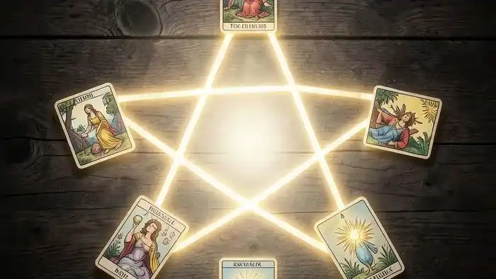 Пентаграмма — древний символ, олицетворяющий гармонию пяти элементов (Земля, Вода, Воздух, Огонь, Дух). В контексте Таро, согласно традиции, заложенной Артуром Эдвардом Уэйтом и развитой другими школами, эта геометрия не случайна. Она заставляет нас рассматривать ситуацию не линейно, а как систему. Каждая карта влияет на две соседние, создавая динамическую картину. Это похоже на теорию синхроничности Карла Юнга — карты выстраиваются в паттерн, отражающий глубинные психические процессы вопрошающего.
