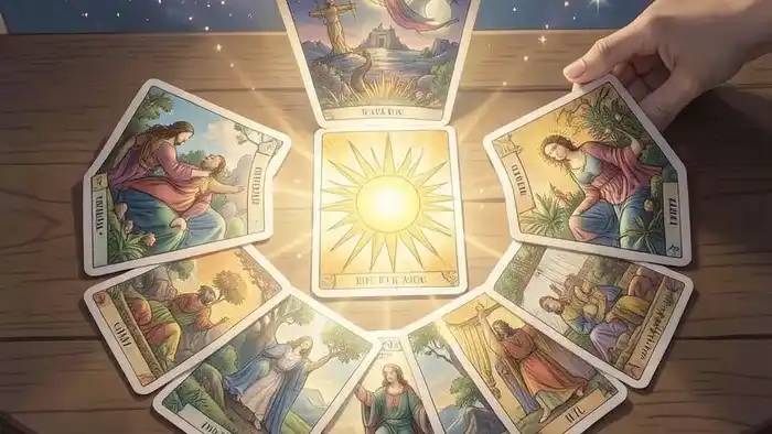 - 7. Послание: Солнце. Главный совет — обратиться к радости, к свету внутри себя. Фокус на детской простоте, творчестве, жизни «здесь и сейчас». Это исцелит скорбь (5 Кубков).