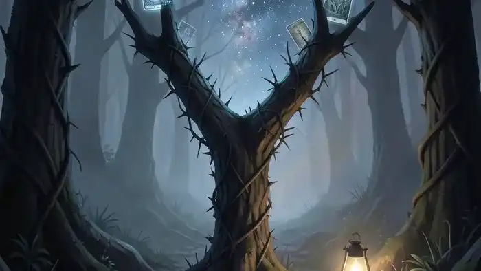 Он показывает ту самую развилку, на которой вы стоите: одна дорога ведёт вглубь леса страха, другая — к просвету. И карты, как безмолвные советники, освещают обе тропы.