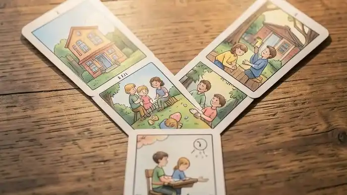 Расклад состоит из пяти карт, расположенных в виде «Y»: центральная карта – текущая ситуация, две ветви – альтернативные варианты (например, школа А и школа Б), а две боковые карты – внешние факторы и внутренние чувства.