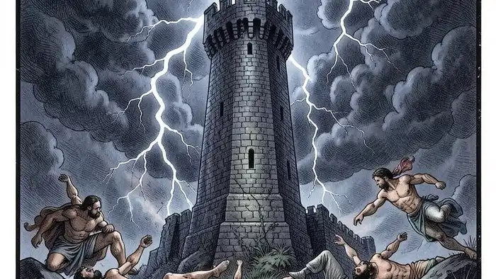 Молния — символ внезапного просветления, которое разрывает иллюзии. Огонь — очищающая сила, сжигающая старое. Падающие фигуры — страх и освобождение одновременно. В сочетании эти элементы образуют архетип «трансформации через разрушение».