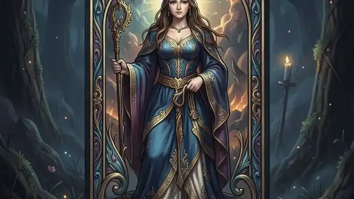 Каждый элемент на карте — это слово в её языке. Жезл в её руке — не скипетр власти, а символ связи с духовным миром (арканом Верховная Жрица) и творческой энергией. Корона из двенадцати звёзд — отсылка к зодиакальному циклу, полному годовому обороту. Подушка с сердечком — открытое, чувственное сердце. Даже её поза, расслабленная и уверенная, говорит о принятии себя и своего положения в мире. Она не борется, она пребывает. И из этого пребывания рождается всё новое.