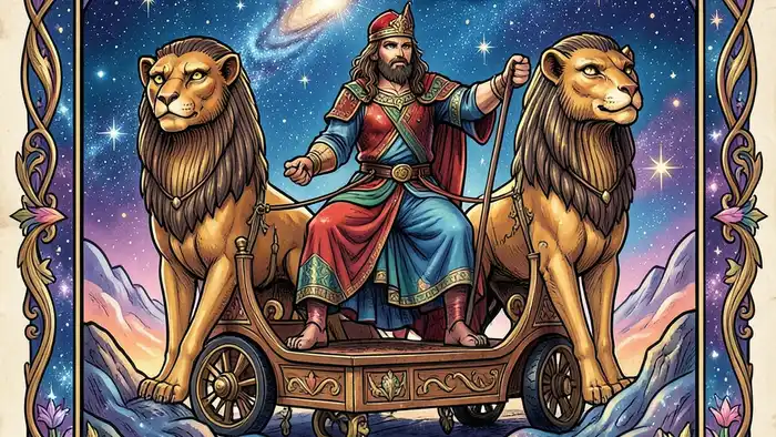 Архетип героя, представленный в Колеснице, имеет глубокие корни в мифах. В греческой мифологии Персей, одолевший Медузу, символизирует победу над страхом, а в индийском эпосе «Махабхарата» Арджуна — это воин, который учится управлять своей энергией под руководством Кришны.