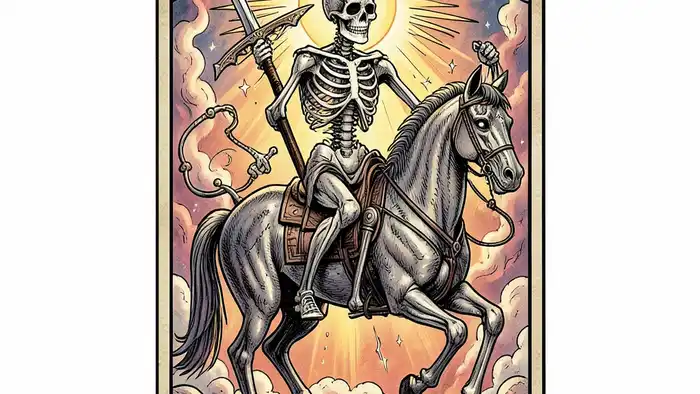 Визуальные детали карты Смерть полны символов. Сквозь лошадь пробегает свет, символизирующий просветление; в руке скелета — меч, разрезающий прошлое; в фоне — восходящее солнце, указывающее на новый день. Каждый элемент имеет своё значение, и их комбинация формирует глубокий смысл.