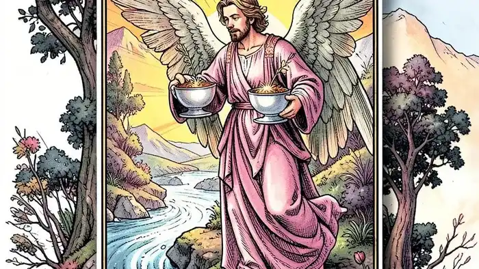 На карте изображён ангел, стоящий на берегу реки, в одной руке держит чашу, в другой — другую. Между чашами поток воды, символизирующий перемену и движение. По мнению А.Э. Уэйта, автор знаменитой колоды «Таро Уэйта», ангел олицетворяет духовную связь между небесами и землёй, а вода — поток сознания.
